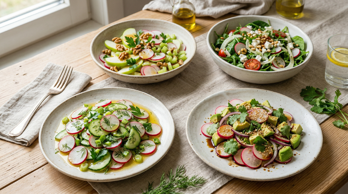 Во-вторых, обратите внимание на подачу. Эти салаты очень красивы сами по себе: розовые кружочки редиски, зелень огурца или авокадо, белоснежный дайкон, оранжевая морковь. Не сваливайте всё в глубокую миску, а разложите на плоской тарелке, чтобы цвета были видны. Еда, которая выглядит красиво, кажется вкуснее — это не кулинарное суеверие, а вполне подтверждённый факт.