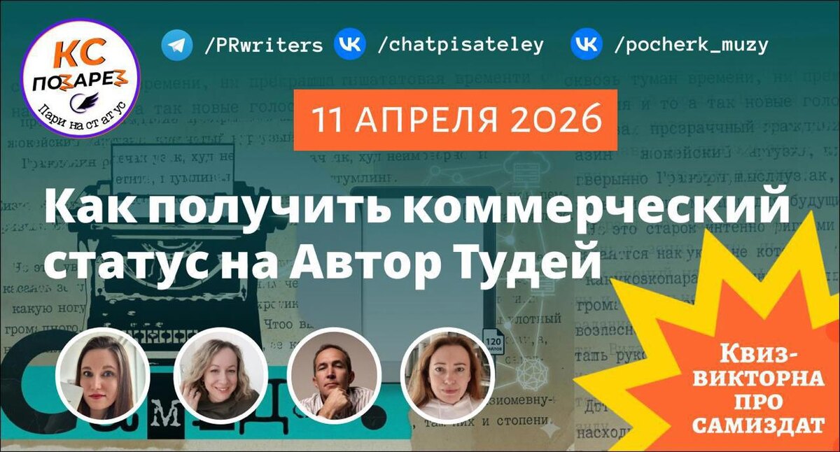 эту субботу на созвоне в писательском сообществе https://t.me/PRwriters, мы же в ВК https://vk.com/chatpisateley Созвон делаем совместно с сообществом "Почерк музы" в рамках их нового проекта "КС позарез" - реалити шоу для писателей. Мероприятие открытое и бесплатное, регистрация обязательна: https://forms.gle/WjEhbWMrs4Ui945FA (ссылка на созвон придёт вам на почту). Приходите, пока будете красить яички)) будет интересно!