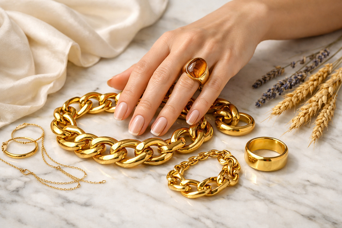 Также жёлтое золото легко вписывается в многослойность. Несколько цепей разной длины или сочетание кольца и браслета создают ощущение продуманности, даже если базовая одежда остаётся простой.