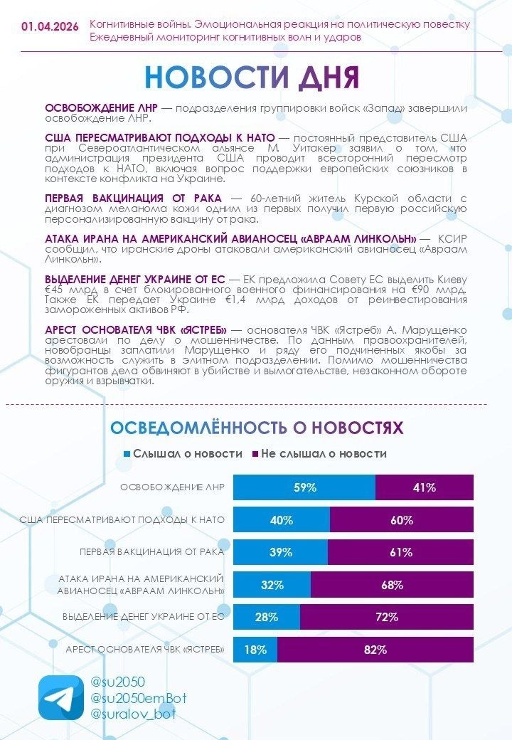 01.04.2026 🔹 Большинство респондентов (61%) во время опроса находились в спокойном эмоциональном состоянии, 21% ощущали усталость, 8% — бодрость, 4% — нервозность, и 3% грустили. 🔹Осведомленность о новостях средняя, варьируется от 18% до 59%. Самой известной оказалась новость о полном освобождении ЛНР (59%). Она же оказалась самой позитивной — 23% выразили одобрение, 22% — надежду, 19% — радость, 10% — удовлетворение, 7% — гордость. 🔹 Так же весьма позитивной респонденты отметили новость о первой вакцине от рака. 31% — выразил надежду, 19% — одобрение, 15% — интерес, 7% — гордость, 5% — радость. 🔹 Самой негативной новостью, что неудивительно, стало выделение ЕС денег для Украины. 44% отнеслись к ней нейтрально, из них 46% — ожидали подобного, 38% — ждут развития событий. 17% выразили раздражение, 15% — отвращение, по 8% — ненависть и злость. 🔹 51% опрошенных затруднились с определением инфовброса. 18% указали что инфовбросом является новость о пересмотре США отношения к НАТО