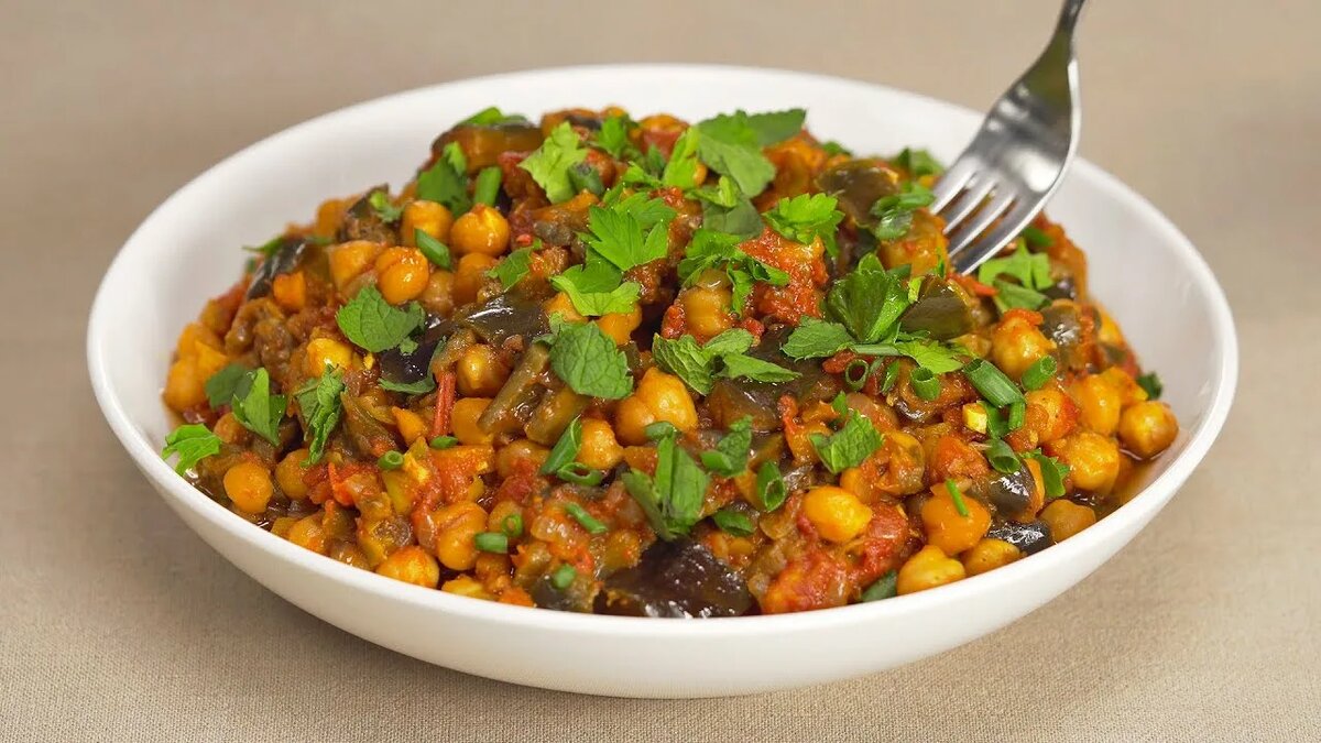 Ароматное, густое и очень полезное блюдо средиземноморского типа. Не содержит продуктов животного происхождения (подходит для поста) и составлено с учётом контроля уровня глюкозы в крови. 📋 Ингредиенты (на 3 порции): Нут (отварной или из банки) - 200 г Баклажан - 1 крупный (~300 г) Кабачок - 1 средний Томаты в собственном соку - 200 г Лук репчатый - 1 шт. Чеснок - 2 зубчика Оливковое масло - 1,5 ст. л. Паприка, зира, базилик - по вкусу Соль - по вкусу 🍳 Приготовление: 1. Баклажан и кабачок нарезать кубиками, слегка посолить, оставить на 10 минут, затем промыть (уберёт горечь). 2. В глубокой сковороде разогреть масло, обжарить лук и чеснок 2 минуты. 3. Добавить баклажан и кабачок, тушить 5–7 минут. 4. Влить томаты, добавить нут и специи. Тушить под крышкой 15–20 минут на медленном огне. 5. Перед подачей посыпать свежей зеленью. 📊 Пищевая ценность (на порцию): - Калории: ~240 ккал - Белки: 9 г - Жиры: 7 г - Углеводы: 32 г - Клетчатка: 10 г - ГИ блюда: низкий (~40). 💡 Почему подхо
