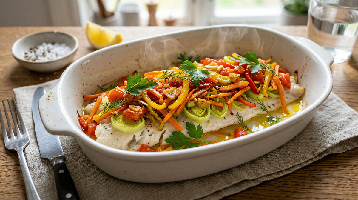 Есть блюда, которые незаслуженно обходят стороной. Минтай — одно из них. Его покупают в основном из соображений экономии, готовят на скорую руку и особенно не церемонятся с подачей. А потом удивляются, что на тарелке оказывается нечто сухое, безвкусное и совершенно непривлекательное. Но если подойти к процессу иначе — с уважением к продукту и парой кулинарных хитростей — этот скромный обитатель Тихого океана способен по-настоящему удивить. Минтай под овощной шубой с молодым луком-пореем тому прямое доказательство. Постное блюдо, которое выглядит нарядно, пахнет так, что домашние начинают заглядывать на кухню ещё до готовности, а по вкусу не уступает ресторанным рыбным запеканкам.