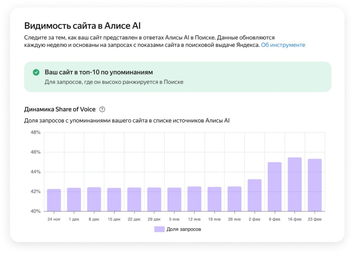 ? В Яндекс вебмастере важнейшее обновление! Появился функционал отслеживания присутствия сайта в нейроответах поисковой системы. Можно посмотреть как свой сайт, так и сравнить с конкурентами по доле их присутствия в ответах Алисы AI. У сайтов с небольшой посещаемостью пока может быть пусто на графиках. Мы всё ближе и ближе к тому, что поисковая система полностью перейдет на выдачу GTP-like. Михаил Сливинский Мы видим растущий интерес со стороны наших партнеров к представленности в ответах «Алисы AI» в «Поиске», поэтому развиваем решения, которые делают оценку этого показателя более прозрачной и помогают найти потенциал для роста. Чтобы повысить вероятность попадания в список источников, мы рекомендуем работать с качеством контента — страницы сайта должны включать экспертную, полезную, оригинальную и содержательную информацию для решения задачи пользователя. Находится здесь: webmaster.yandex.ru -> Эффективность -> Показы сайта в Алисе AI