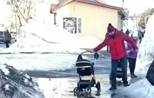Люди идут по воде, обходят как могут, кто-то тащит коляску прямо через это месиво. Видимо, именно так сегодня в Петропавловске и должен выглядеть «комфортный» городской маршрут, задаются вопросом камчатцы.