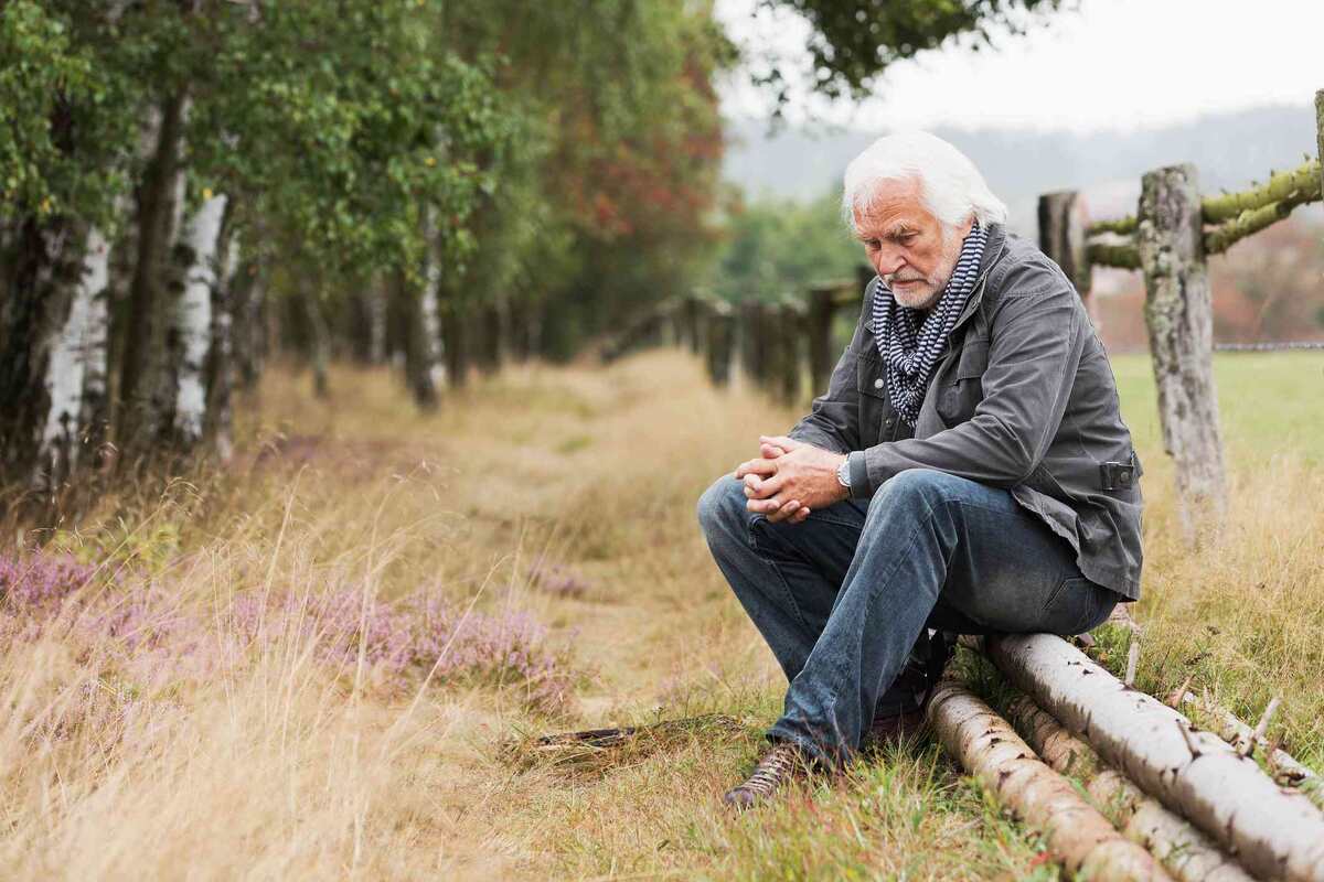 Он идёт медленно, опираясь на палку. Снег скрипит под ногами. Вокруг — сосны, тишина.