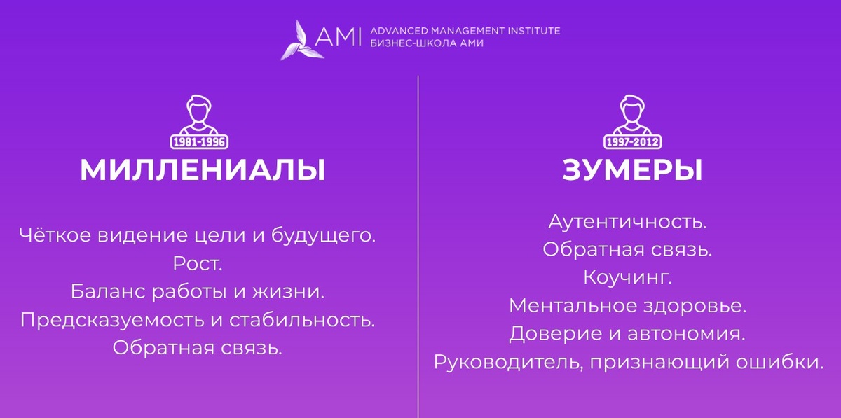 В большинстве команд сегодня работают и те, и другие. Миллениалы (1981–1996) и зумеры (1997-2012) сидят рядом, делают общие проекты, но при этом ждут от руководителя совершенно разного. То, что раньше отлично мотивировало одних, другим уже кажется устаревшим. Что показывают данные 2025 года💜 💜По данным Deloitte Global 2025 и Gallup, миллениалы ценят в руководителе: 💜Чёткое видение — зачем мы это делаем и куда движемся. 💜Реальные возможности для роста. 💜Уважение к балансу работы и жизни. 💜Предсказуемость и стабильность. 💜Обратную связь — регулярную, но без ощущения микроменеджмента. Они выросли с установкой «карьера — это марафон». Готовы вкладываться, если видят перспективу и чувствуют поддержку. 💜У зумеров запросы другие: 💜Аутентичность — не корпоративная маска, а живой человек рядом. 💜Обратная связь прямо сейчас. 💜Коучинг вместо «я сказал — ты сделал». 💜Внимание к ментальному здоровью и ощущению безопасности. 💜Доверие и автономия, без постоянного контроля. 💜Руково