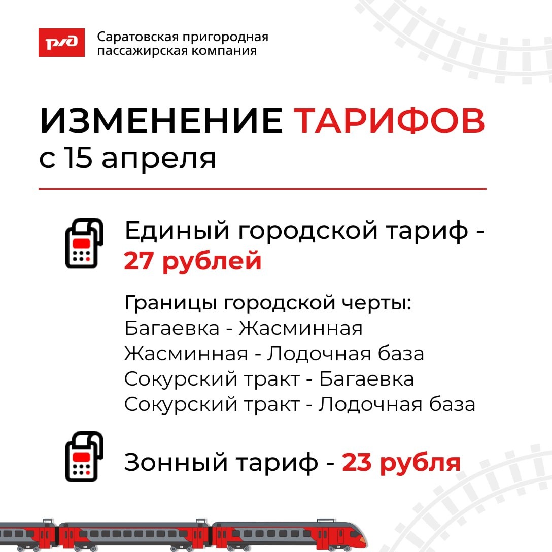 📣 ⚡️С 15 апреля 2026 года изменяется тариф на проезд в пригородных поездах В Саратовской области стоимость проезда в пределах одной зоны составит 23 рубля Стоимость единого городского тарифа города Саратов составит 27 рублей Наименование участков действия единого городского тарифа города Саратов: ▫️«Багаевка - Жасминная»; ▫️«Жасминная - Лодочная База»; ▫️«Сокурский Тракт - Багаевка»; ▫️«Сокурский Тракт - Лодочная База». ⏩ Для школьников и студентов очной формы обучения скидка 50% от полной стоимости проезда при предъявлении студенческого билета/справки с места учёбы и льготной транспортной карты Саратовской области 📃 Основание: Постановление Комитета государственного тарифного регулирования тарифов Саратовской области от 03.04.2026 года № 24