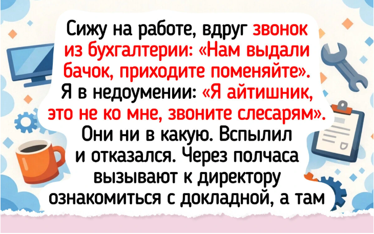 Через полчаса звонит секретарь: директор вызывает. Захожу — у него на столе лежит докладная на меня. И вот что интересно: когда мне звонили, у них был «бачок». А когда писали жалобу, внезапно правильно написали — системный блок. © te2o