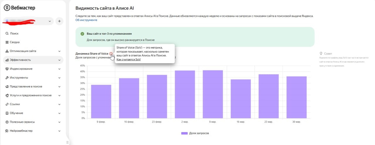 Яндекс выкатил в Вебмастере - https://webmaster.yandex.ru/site/efficiency/alice/ На скриншоте данные по одному из клиентов, о котором писал ранее - получили продажу с ИИ-ответов - бухгалтерские услуги. Чтобы понять как считается параметр SoV нужно изучить мегамануал по ссылке. Ну что ж, дело сдвинулось с мёртвой точки, будем надеяться, что инструмент будет развиваться 🥳 Источник: https://webmaster.yandex.ru/blog/efficiency-alice #VysokoffНаблюдает — G GATE CONF ⚫️ 26-27 июня ⚫️ 7000+ участников @vysokoff
