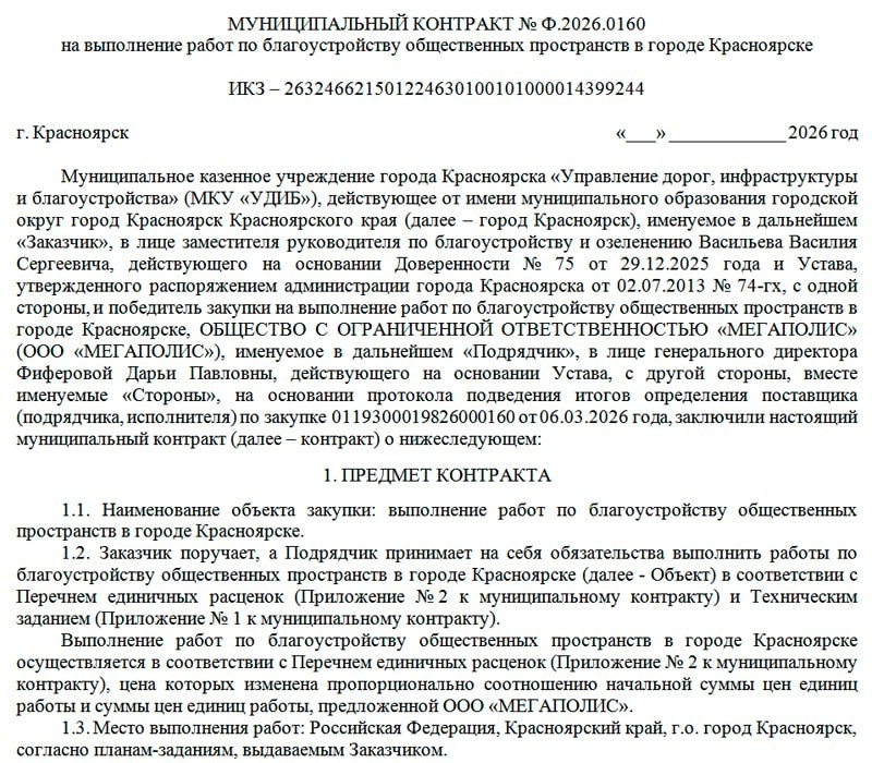 Мэрия Красноярска подписала контракт на благоустройство парка Гвардейский. Там, как говорили чиновники в 2025 году, появится аллея флагов до «зоны, посвящённой СВО», историко-патриотический центр, военная техника и визит-центр. Власти заключили контракт на первый этап реконструкции с ООО «Мегаполис» за 248 млн рублей, говорится на сайте госзакупок. Фирма должна уложить плитку, поменять скамейки и урны, поставить заборы, информационные указатели, велопарковки и бетонные горшки под цветы. Кроме того, «Мегаполис» установит входные арки из металла, одна из них будет в цветах георгиевской ленты. Появятся и камеры видеонаблюдения. «Основная задача первой очереди — подготовить территорию для насыщения локациями военно-исторической тематики и патриотического воспитания, а также площадками отдыха. Их размещение запланировано на втором этапе в будущем году», — написал в своём телеграм-канале мэр Сергей Верещагин. 📌 «Мегаполис», по данным сервиса «Контур. Фокус», принадлежит Тарону Малхасяну