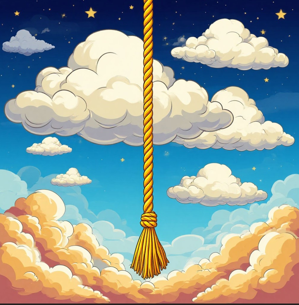Едва возжелал он себе такое, как сверху показалась светящаяся веревка, которую опускала из окна Поднебесной крепости уже знакомая ему красавица.