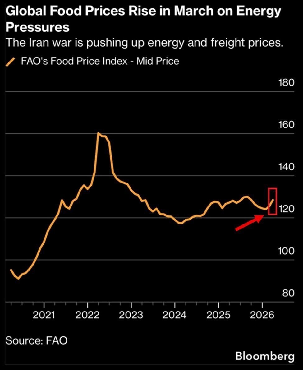 подскочил на +2,4%, достигнув 128,5 пунктов – самого высокого уровня с сентября 2025 года Этот индекс отслеживает мировые цены на зерно, сахар, мясо, молочные продукты и растительные масла @geonrgru | 🇷🇺 MAX | sponsr.ru