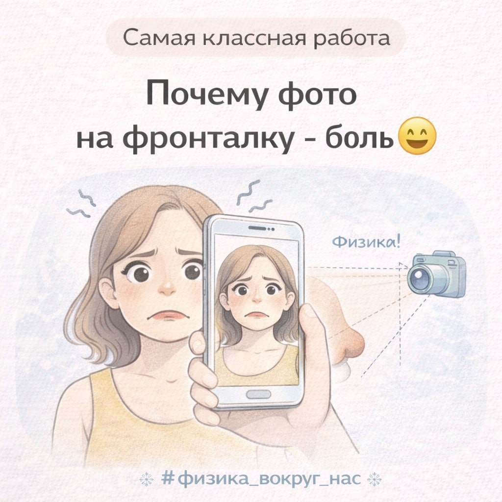 Вы тоже замечали: в зеркале - вроде нормально, на фото с фронтальной камеры - кто этот человек и почему он так близко? И нет, дело не в вас и не в «нефотогеничности». Это снова физика. 📸 Фронтальная камера - это: — короткое фокусное расстояние — съёмка с очень близкого расстояния В итоге: нос кажется больше, лицо - шире, пропорции - искажены. Это называется перспективное искажение. Камера буквально «растягивает» то, что ближе к объективу, и «сжимает» всё остальное. Поэтому: — зеркало в магазине «врёт» — фронталка «обижается» — а вы тут вообще ни при чём Физика снова вмешалась в самооценку. Но теперь хотя бы понятно, кто виноват. #физика_вокруг_нас С фото на фронталку разобрались, следующий пост - разберёмся с видео 🔥 💻 Самая классная работа
