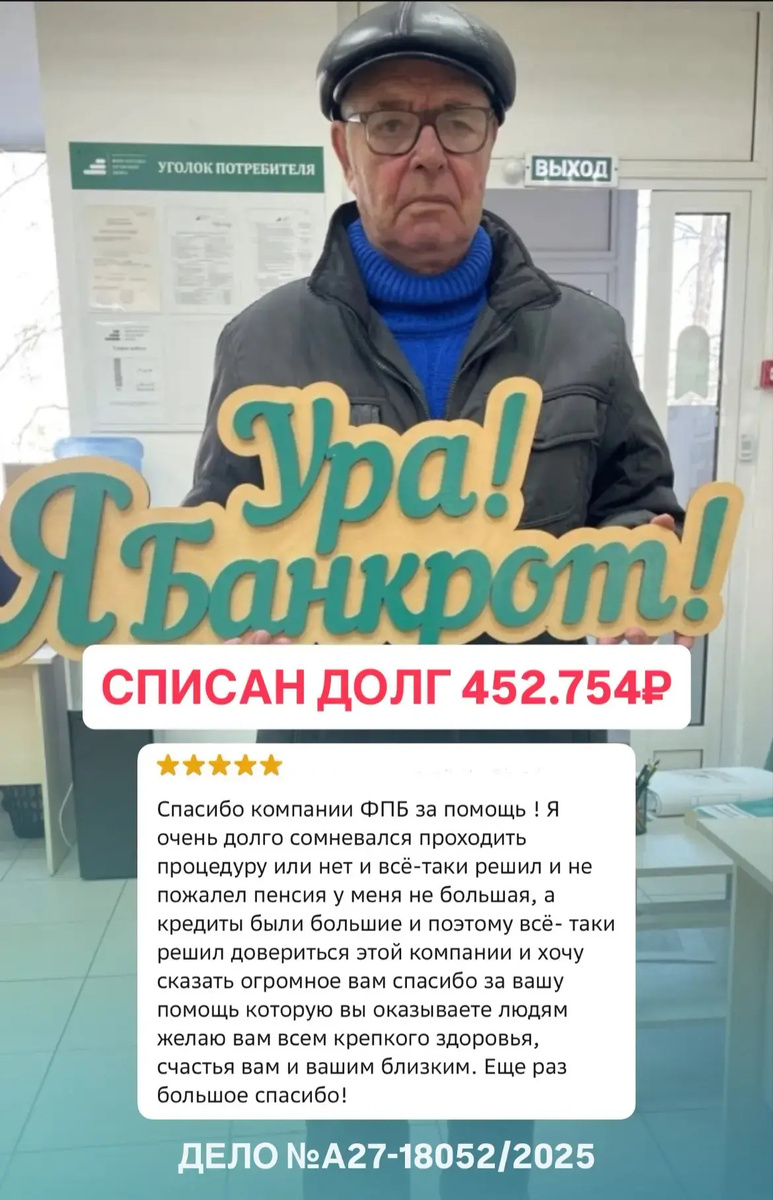 Еще одна история с новым началом! 🔥 За 6 месяцев Сергей Лаврентьевич смог освободиться от всех долгов и начать жизнь без финансового давления. Процедура банкротства это шаг, который требует терпения и грамотного сопровождения. Но когда всё делается по закону и с поддержкой специалистов, результат даёт настоящую свободу. Если вы чувствуете, что долги мешают жить и готовы к переменам - напишите нам. Иногда одна консультация открывает путь к новой жизни!