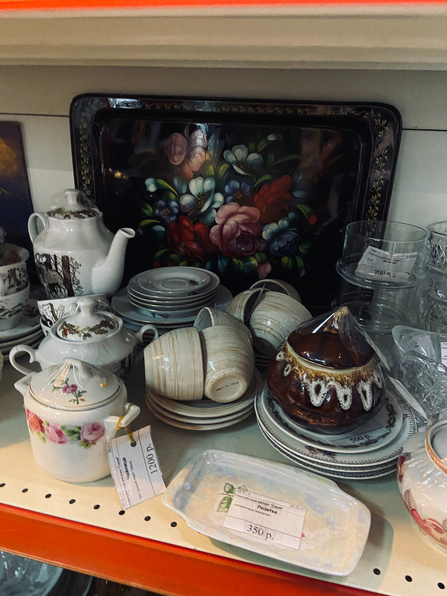 Здесь можно найти и массовую Гжель, Жостовский поднос и много винтажной посуды, книги, украшения