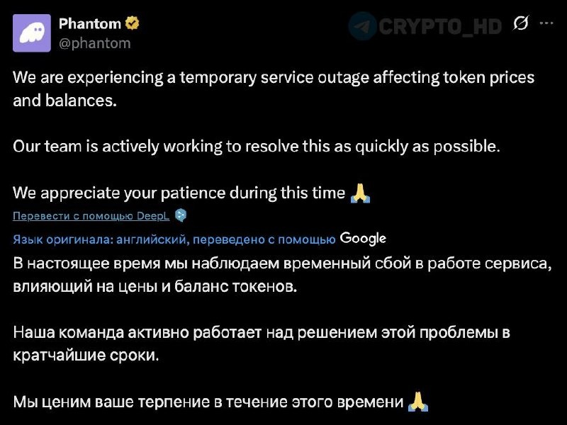 ⚠️ Phantom – зафиксирован сбой в работе кошелька (twitter)