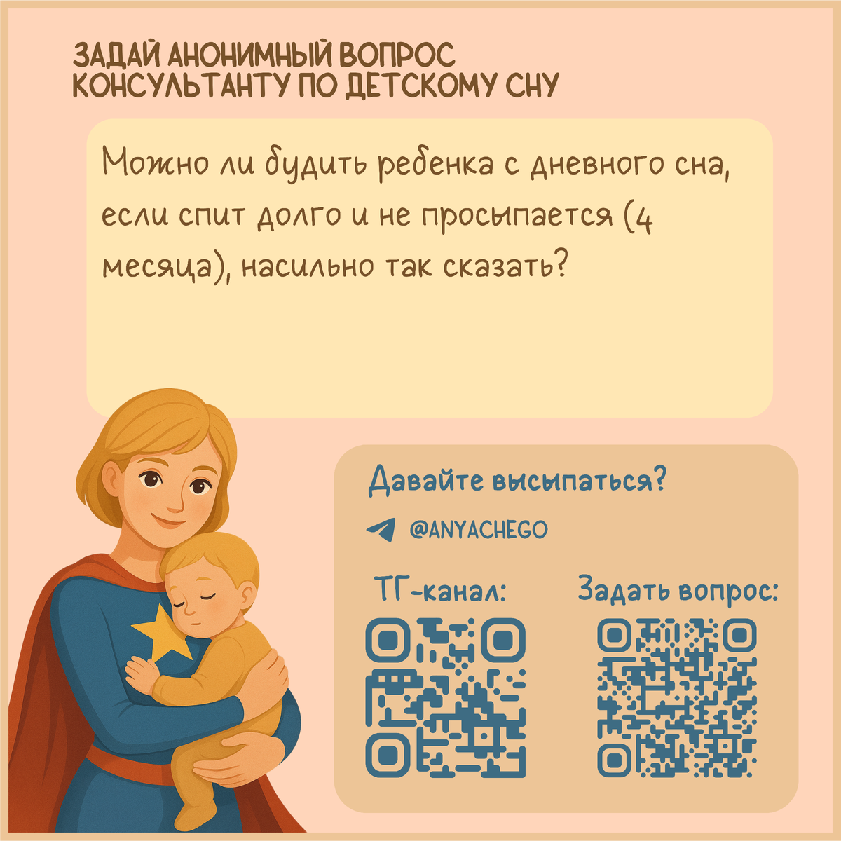 Вопрос от подписчика. Можно ли будить ребенка с дневного сна, если спит долго и не просыпается (4 месяца), насильно так сказать? Конечно, можно. Если вы знаете потребность малыша в суточном сне и понимаете, что слишком длинный дневной сон скажется на остальном сне, то разбудить ребенка - это не насилие. Это нормальная родительская помощь. Ребенок еще не умеет сам регулировать свой режим так, как этого ждут взрослые. Ожидать от младенца саморегуляции сна - всё равно что ждать от него планирования или самоконтроля: нейробиологически он к этому не готов. Именно поэтому роль родителя нельзя недооценивать. Родитель - это внешний регулятор сна ребенка: ☑️ создает условия для настройки внутренних часов.