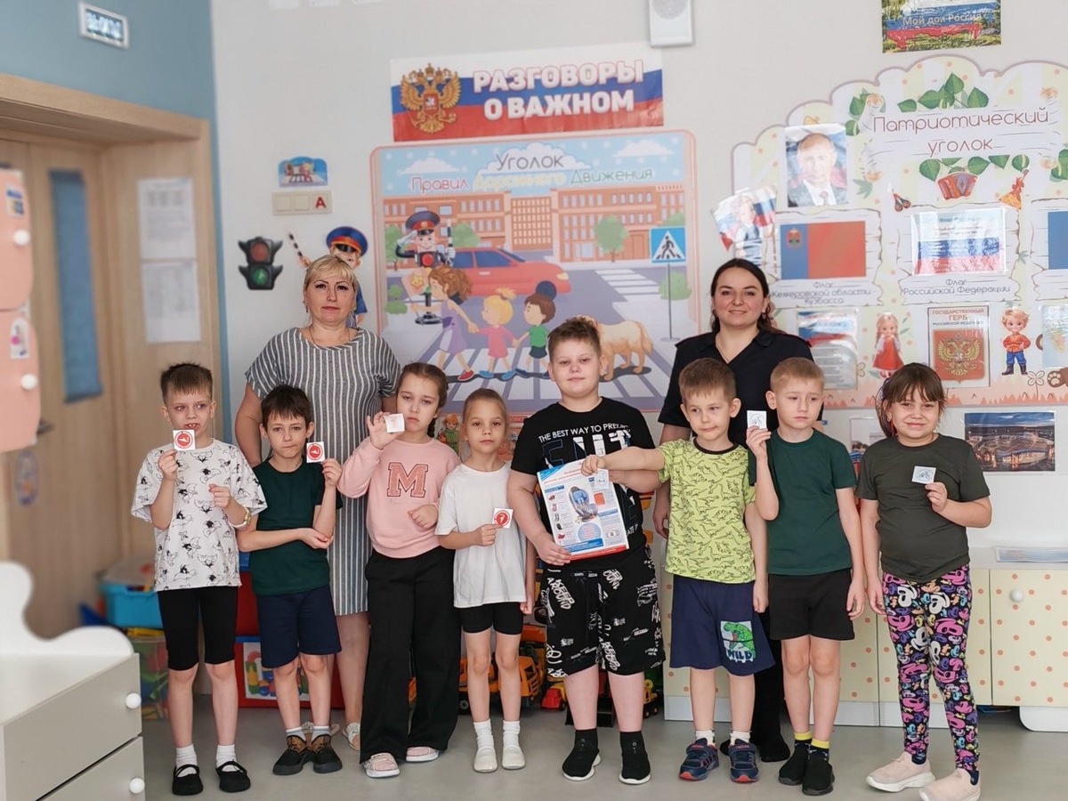 занятие для воспитанников старшей и подготовительной групп. Вместе с героем интерактивной игры «Дорога в школу» юные пешеходы отправились в виртуальное путешествие от дома до школы. По пути они повторяли, как правильно переходить проезжую часть, какие дорожные знаки встречаются на маршруте и как вести себя в общественном транспорте. Особое внимание сотрудники ГИБДД уделили безопасности во время поездки в общественном транспорте. Дошкольникам рассказали, почему нужно держаться за поручни, нельзя отвлекать водителя и высовываться из окон. Дети активно участвовали в обсуждении и отвечали на вопросы. В завершение встречи каждый ребенок получил в подарок световозвращающий элемент — чтобы уже сейчас путь из детского сада домой стал еще безопаснее.