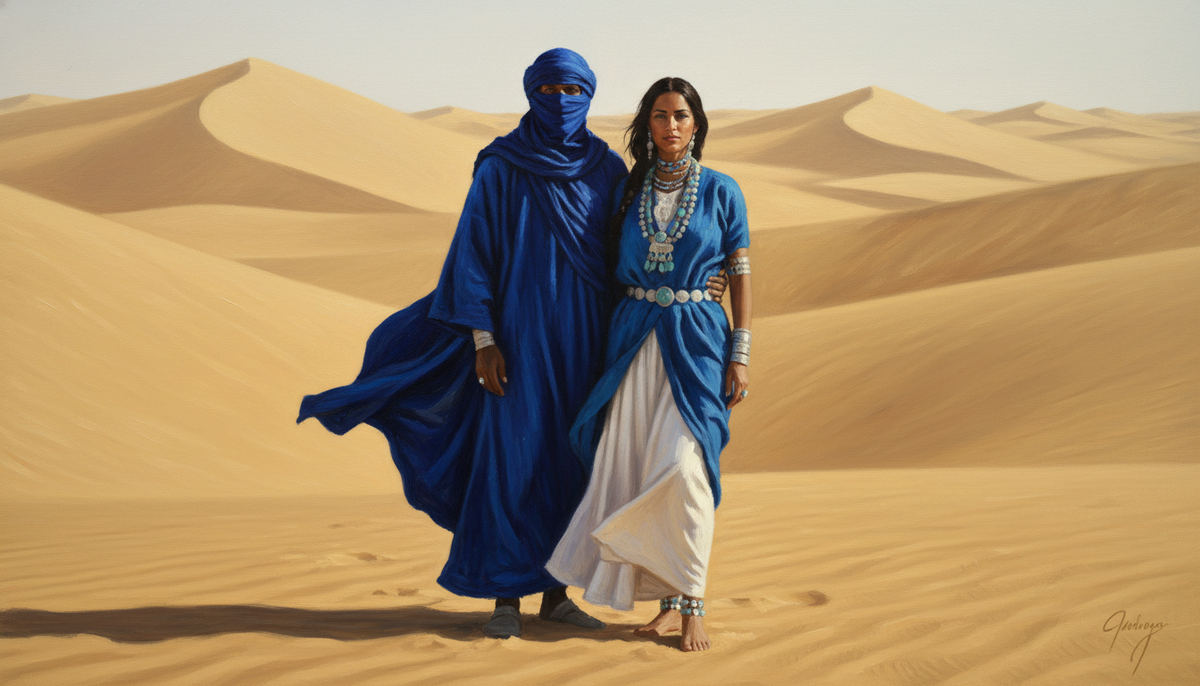 Об их одежде стоит сказать отдельно. Туареги — «синие люди» Сахары. Они красят ткань индиго особым способом: не пропитывают, а буквально вбивают краситель в волокна камнем. Краска со временем сходит на кожу, и тело приобретает синеватый оттенок.