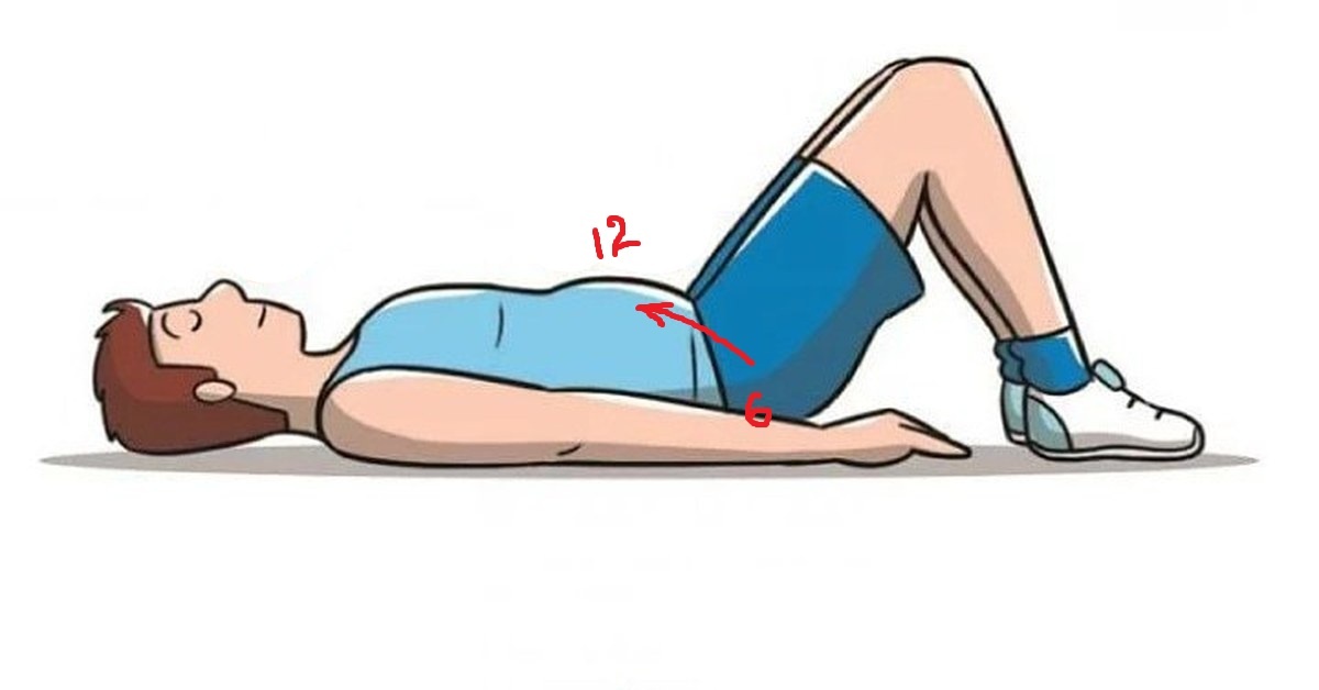 - На выдохе перекатываем таз к цифре 3, вдох, возвращаем в первоначальное положение, снова перекатываем таз, но уже к цифре 9.