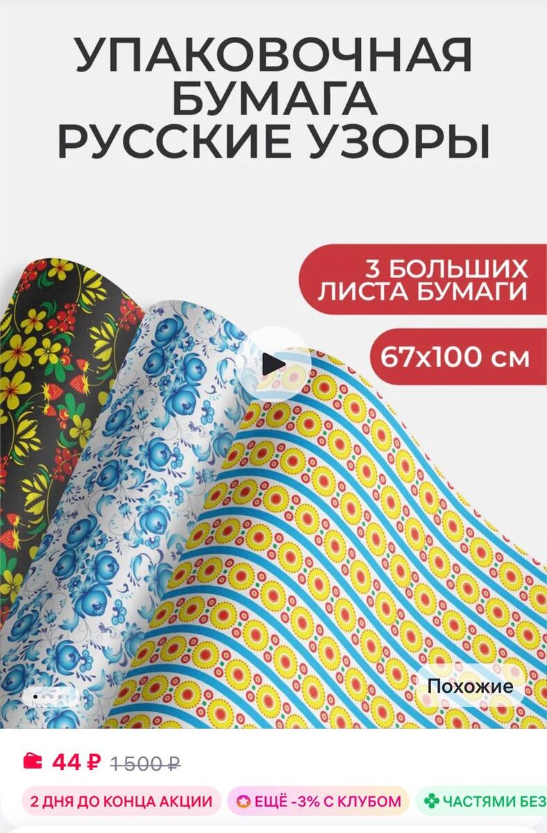 HiBox Набор упаковочной бумаги Русские узоры 3 листа 67×100 см