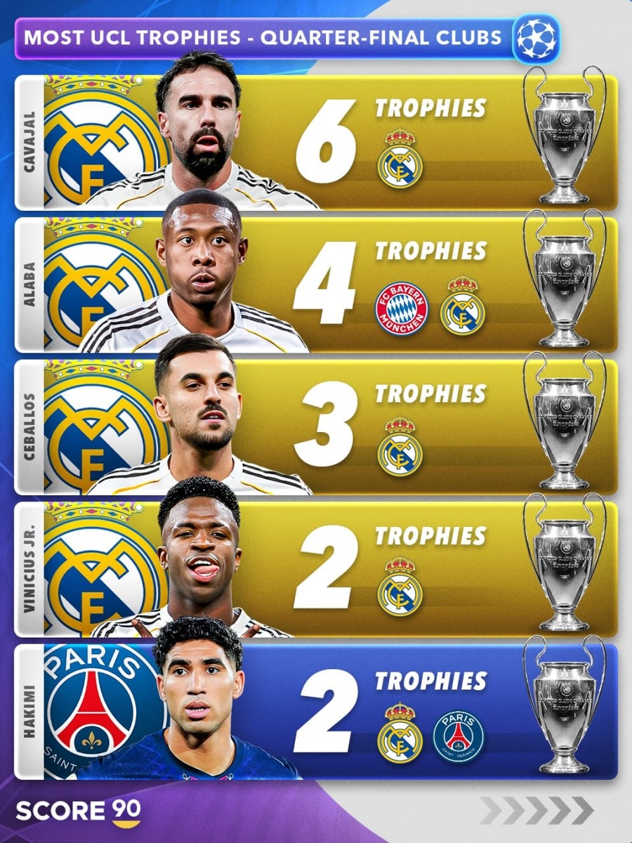 Наибольшее количество трофеев ЛЧ среди игроков, участвующих в четвертьфиналах этого сезона. 🏆