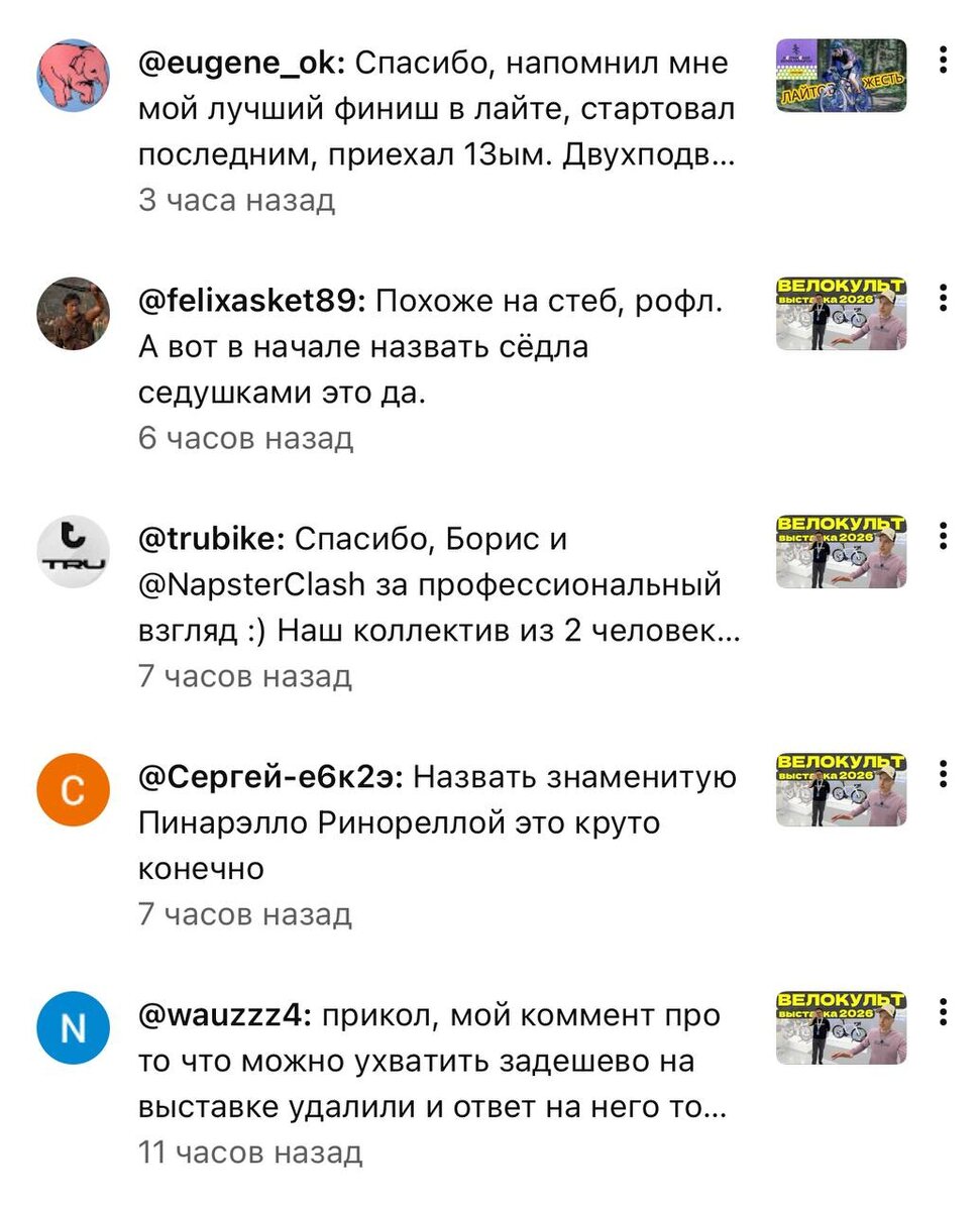 Wauzz4 - он написал абсолютно нормальный коммент что на выставке можно было задешево выцепить товары. Я ему ответил что-то типа «да, наверное, как я об этом не подумал». И он сказал что его коммент самоудалился:( Felixasket - выразил негодование что я седла назвал сидушками. И я не могу открыть этот коммент. Ютуб просто не дает его открыть. Почему так - не знаю 🤷♂️ Кстати а что не так со словом «сидушки». Кто-то мог подумать что я выразил неуважение с велосипедным седлам?🤣 А Сергея зацепило что я назвал Пину Риной😆 Получается я унизил великую Пинареллу?🤣 PS: я иногда сижу с широко открытыми глазами читая подобные комменты. Даже не знаю что об этом думать🤔