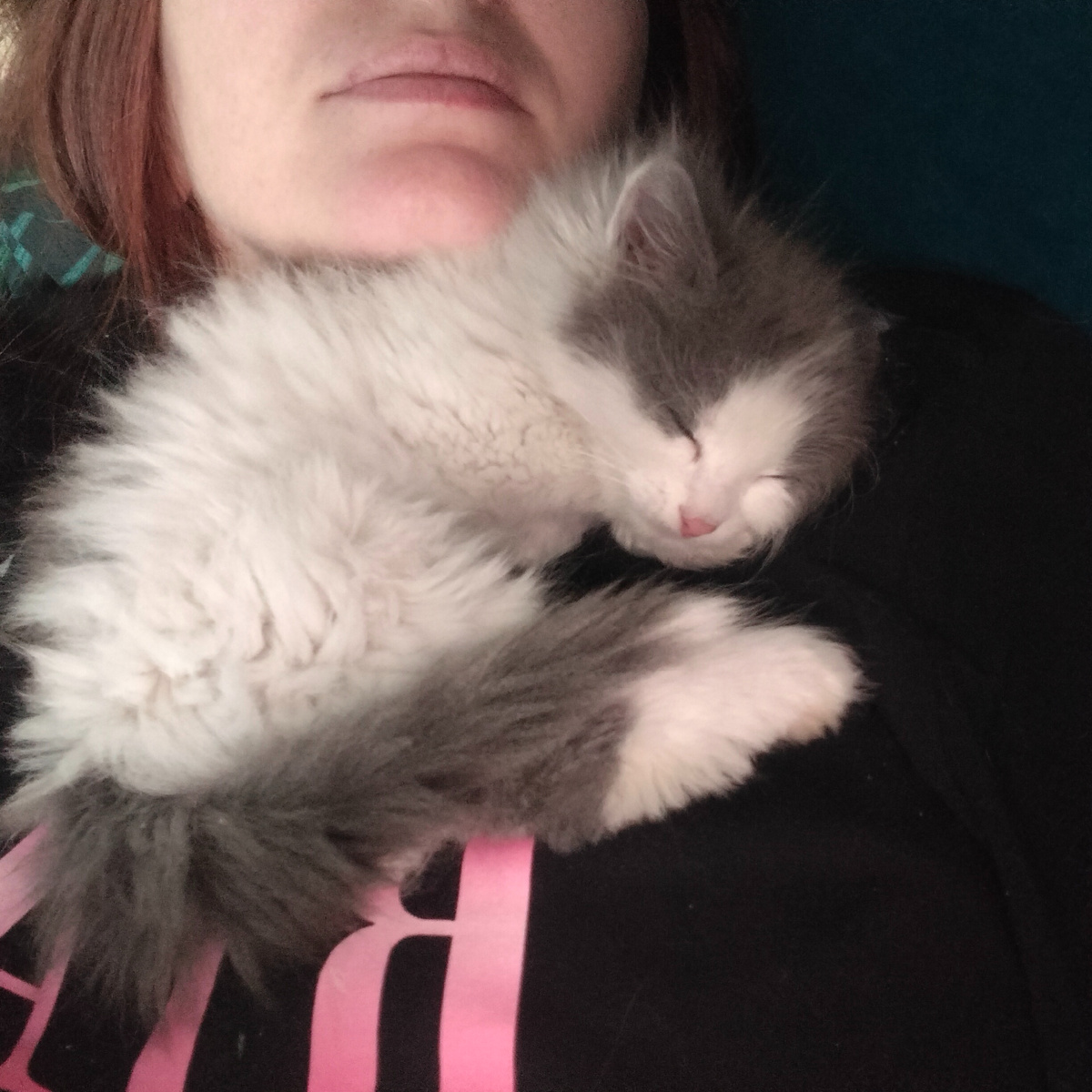 Пушист котёнок просто необычайно. А ещё он очень ласковый и любит людей. Явно совсем недавно жил в доме. Спать он ложился только на Сашу или на меня.