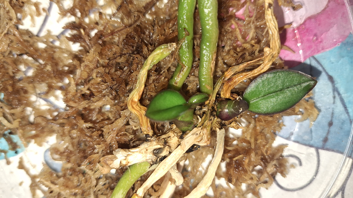 Привет! Помните, я показывала несколько проклюнувшихся деток на стволе орхидеи? Тогда было четыре почки, две из них были покрупнее и там начинали разворачиваться листики. Через два с небольшим месяца такой результат: Это тёмного цвета биглип, размер цветка средний. Из четырёх почек две продолжили развиваться. И ещё покажу некоторые орхидеи с детками: Это розовый крупноцветковый фаленопсис-каскадник. Шея у него длинная, ствол сильно наклонился и тянется куда-то в сторону. Внутри горшка много корней, как и снаружи. У растения крупные листья с прекрасным тургором. Подожду, пусть подрастёт детка. Потом, возможно после отделения детки (когда у неё появятся свои корни сантиметров по пять), пересажу саму орхидею. Следующий фаленопсис покупался три месяца назад, тогда я взяла аж пять штук. Вот один сейчас в таком состоянии, что непонятно, будет жить дальше или нет. Корни почти пропали. И вот проклюнулась пристволовая детка, она пока ещё маленькая. Так орхидеи в неважном состоянии пытаются о