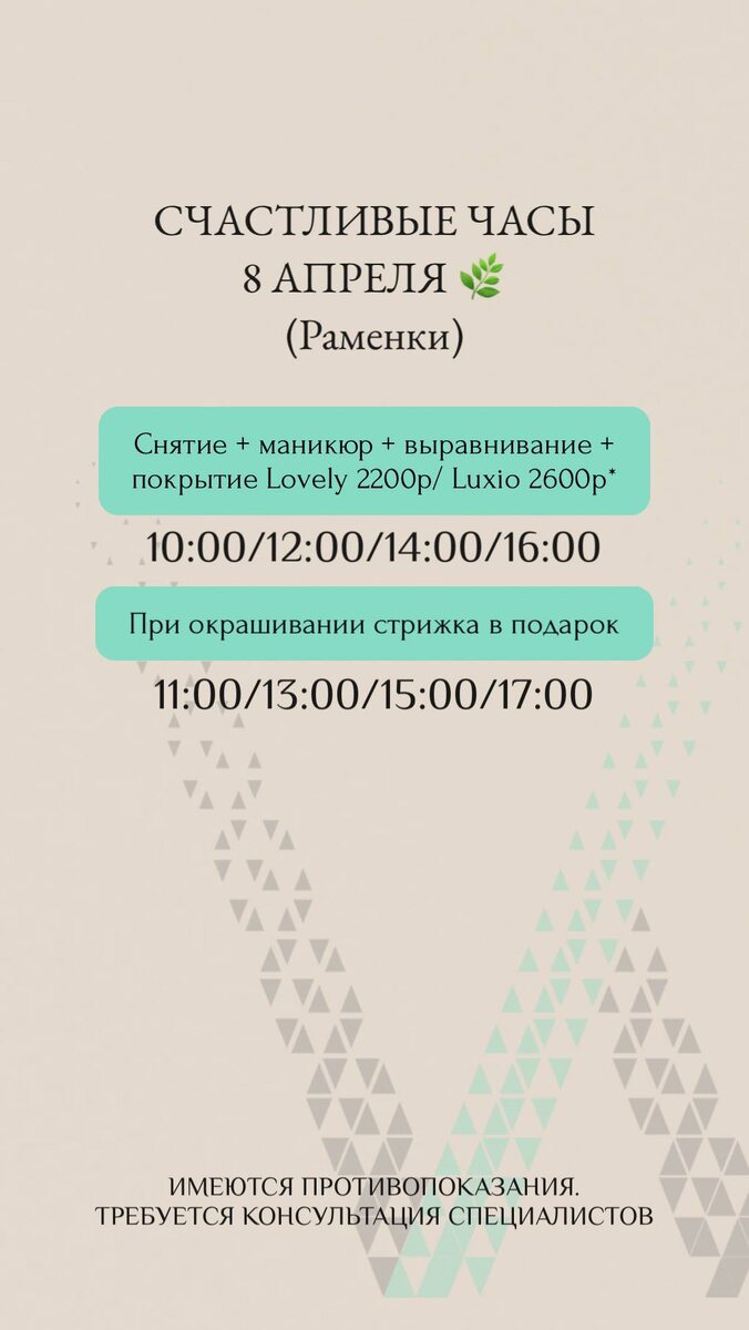 8 АПРЕЛЯ (завтра)🌿 Окна на сегодня 👈 Не упустите возможность записаться на любимые услуги со скидкой 20% Акции и скидки не суммируются! Для записи👇🏻 📞 +7(499)4553857 💌 @womansalonchat