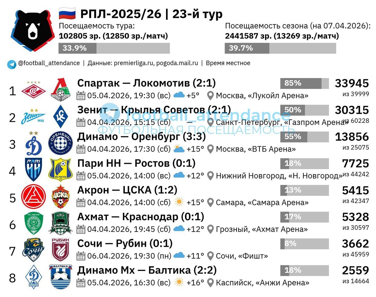 Восемь встреч завершившего тура собрали 102805 болельщиков, что в среднем составило 12850 зр./матч — это на 3% меньше, чем среднее значение сезона (13269). Максимальное число болельщиков пришло на футбол на «Лукойл Арене». 33945 человек на встрече «Спартака» и «Локо» — это 12-я по аудитории игра в текущем сезоне РПЛ. На этом же матче была наибольшая заполненность арены (85%). Матч «Зенит» — «Крылья Советов» (30315) стал 18-м по числу зрителей в текущем сезоне РПЛ. Игра с «Ростовом» стала для «Пари НН» второй по числу болельщиков (7725) на домашних матчах РПЛ-2025/26. Встреча с «Краснодаром» (5328) стала для «Ахмата» рекордной по аудитории в этом сезоне РПЛ. Если брать все турниры, то в Кубке матчи с «Зенитом» (6872) и «Рубином» (5673) собирали больше. Лидеры домашней посещаемости РПЛ после тура (более 14 тысяч зрителей в среднем на каждом домашнем матче): Посещаемость тура Заполняемость стадионов Не забывайте подписаться на канал здесь на Дзен, а также в Телеграм и МАХ! Также вы можете