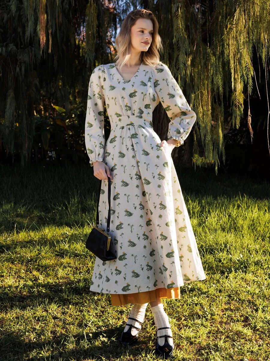 Платье миди с цветочным принтом, V-образным вырезом и длинным рукавом. Женственный силуэт, приталенный крой — для романтичных образов.