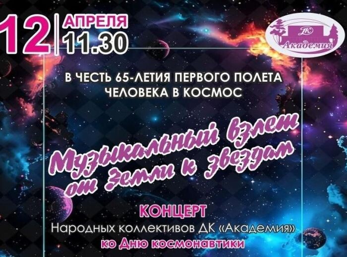 Концерт народных коллективов ДК «Академия» ко Дню космонавтики пройдет в новосибирском Академгородке в воскресенье, 12 апреля. https://academ.info/news/culture/49884/