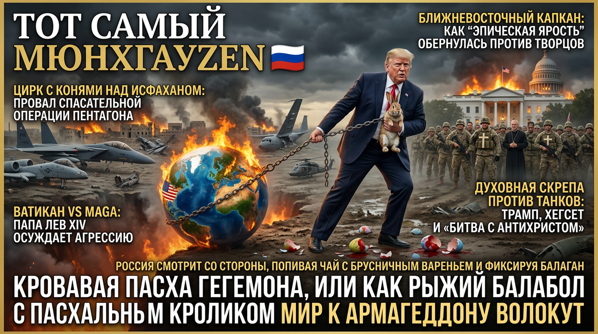 В воздухе пахнет паленым порохом и дешевыми понтами. Администрация Трампа, этот балаган шутов и милитаристов, влезла в Иран, думая, что проглотит его как пирожок. Вышло иначе: подавились, да так, что искры из ушей посыпались. И пока рыжий Наполеон с пасхальным кроликом на руках вещает об «адских бомбардировках» и «божественном предназначении убивать иранцев», мир замер на грани пропасти. А мы, как всегда, смотрим на этот балаган со стороны, попивая чай с брусничным вареньем и фиксируя, как «мировая полиция» превращается в посмешище.