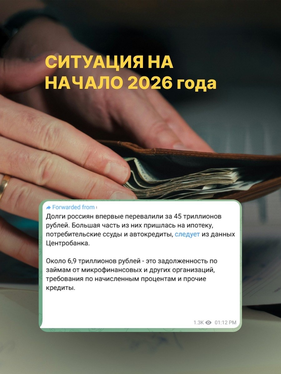 ❌ Берёте новые займы, чтобы закрыть старые ❌ Коллекторы звонят вам и вашим близким ❌ Вы перестали спать по ночам из-за мыслей о деньгах Если хотя бы один пункт про вас — значит кредитная нагрузка становиться очень тяжелой. Вы начинаете экономить на базовых потребностях, медицине, хорошей, здоровой еде. Нет подушки безопасности. Вы не одни в этой ситуации. 45 триллионов рублей долгов у граждан. Такая цифра накопилась у россиян по кредитам к началу 2026 года. За последний квартал долги выросли ещё на 2,2% — почти на 1 миллиард рублей. Что в этой сумме: 🔹 Ипотека — 21,7 трлн рублей (почти половина всех долгов) 🔹 Потребительские кредиты — 13,4 трлн рублей 🔹 Автокредиты — 3 трлн рублей 🔹 Остальное — проценты, микрозаймы, штрафы ТО есть, это миллионы семей, которые каждый месяц отдают банкам всё, что заработали. Что делать? Оценить свою ситуацию со стороны. Не на глазок, а честно "разложить все по полочкам" - сможете ли вы самостоятельно с этим справиться, или пора воспользоватьс