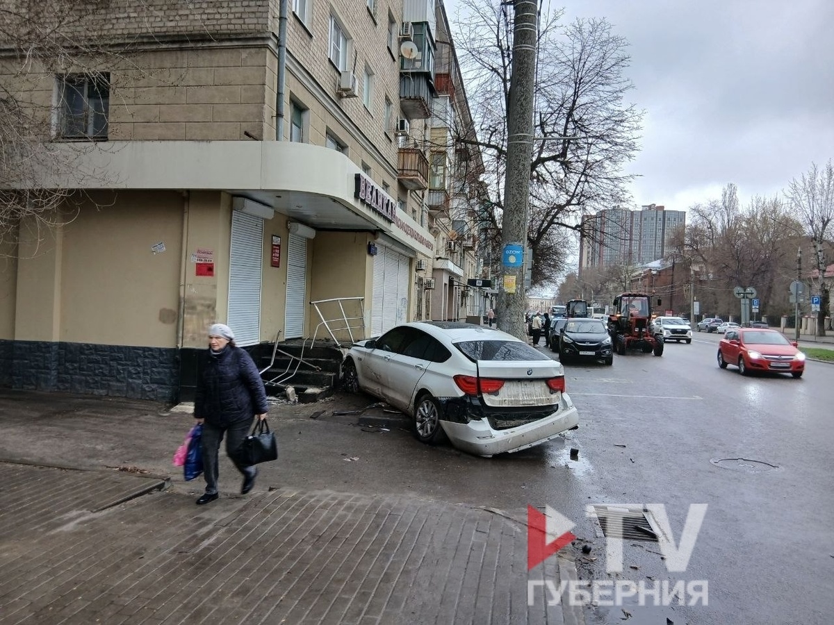 BMW снесла ограждение и крыльцо магазина на улице Кольцовской Воронеже. Вероятно, ДТП случилось рано утром 7 апреля. Фото с места в редакцию прислал очевидец. Судя по кадрам, машина ещё зацепила столб. Скорую на месте не видели. Номеров у BMW на момент съемки не было.