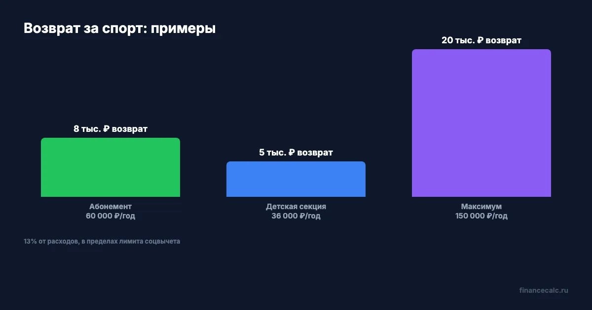 Представьте: вы платите 5 000 ₽/мес за фитнес-клуб. За год — 60 000 ₽. Вычет 13% — 7 800 ₽. Плюс детская секция за 3 000 ₽/мес (36 000 ₽ в год) — ещё 4 680 ₽. Итого 12 480 ₽ возврата за семью. На эти деньги можно оплатить два месяца абонемента.