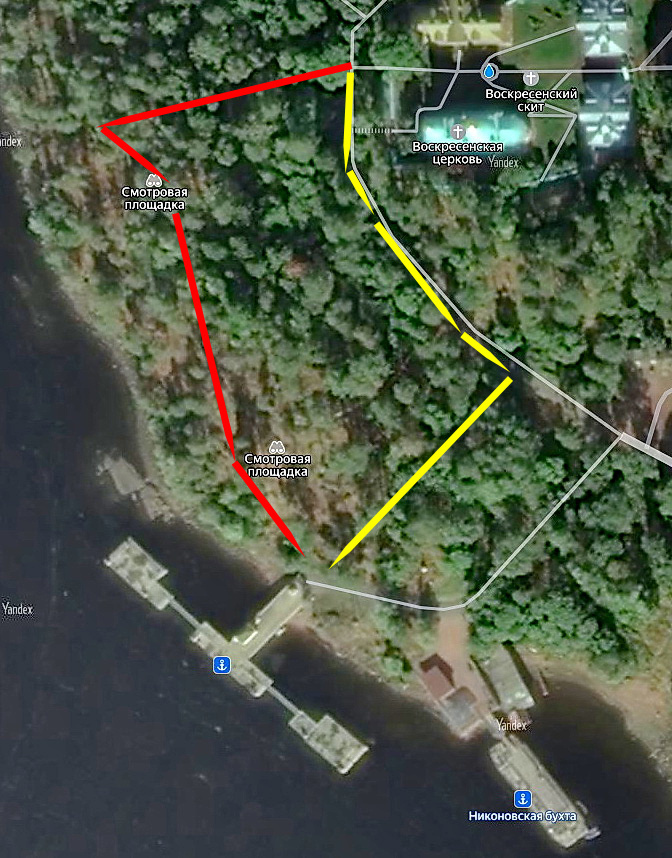 В предыдущей статье мы побывали на территории Воскресенского скита. Я посещал скит два раза – в 2011 и 2024 годах, добирался до него разными путями: первый раз по берегу снизу, второй – по верху от Поклонного креста, расположенного на Главной Монастырской дороге. Сегодня я предлагаю пройти от скита к причалу тоже двумя маршрутами, сначала вдоль берега, как я это сделал в 2011 году, потом - второй вариант. Через полсотни метров к западу от скита открывается вид на Большую Никоновскую бухту и три острова, ограничивающие бухту с запада (слева направо): Руиссаари, Каурасаари и Никоновский. Через одну-две минуты хода пейзажи меняются, как картинки в калейдоскопе, даже не сходя с места, можно сделать несколько снимков с совершенно разными сюжетами. На снимке ниже – сквозь ветви сосны слева виден остров Руиссаари, правее – северный вход в бухту. Ещё один взгляд (между скалой и сосной) на один из трёх островов. Густые заросли слева от тропы. А внизу, у самой воды, красивая кудрявая берёзка. На