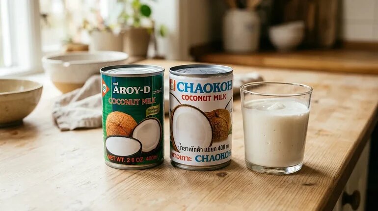 Прежде чем перейти к рецептам на кокосовом молоке, давайте быстро разберёмся с продуктом. В магазинах встречаются два варианта: в жестяных банках и в тетрапаках. Берите первое. В банках — чистое молоко без загустителей и сахара. Лучшие марки, проверенные годами: Aroy-D, Chaokoh. Перед покупкой тряхните банку — если внутри булькает, молоко жидкое, если тихо — густое, как сметана. И то и другое годится, просто для супов лучше густое, а для блинов и жидкое сойдёт. Кокосовая вода из молодых кокосов нам не нужна — это совсем другой продукт.