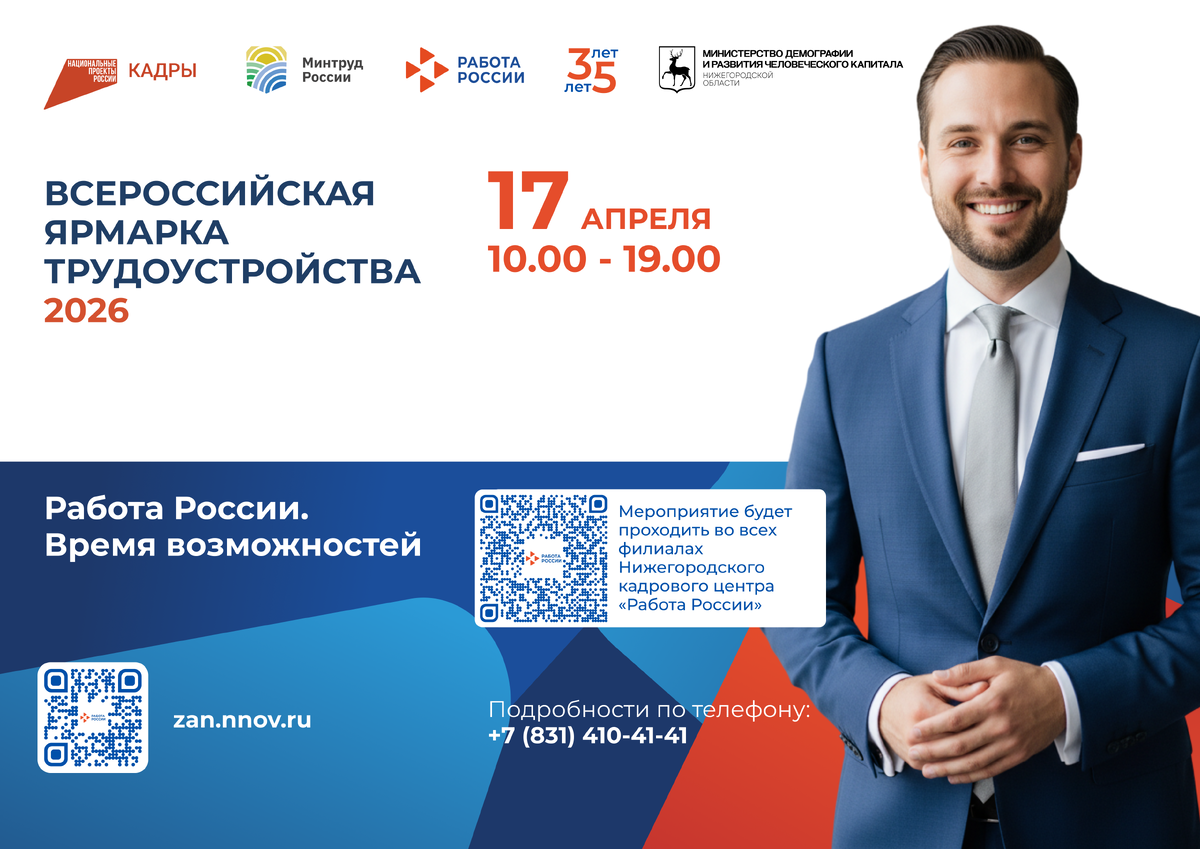 17 апреля 2026 года в Нижегородской области состоится региональный этап Всероссийской ярмарки трудоустройства «Работа России. Время возможностей». Главной площадкой станет Сормовский филиал Нижегородского кадрового центра «Работа России» в Нижнем Новгороде (ул. Коминтерна, 137). Мероприятие также охватит 35 районных филиалов службы занятости, что позволит жителям получить доступ к современным кадровым сервисам рядом с домом.
