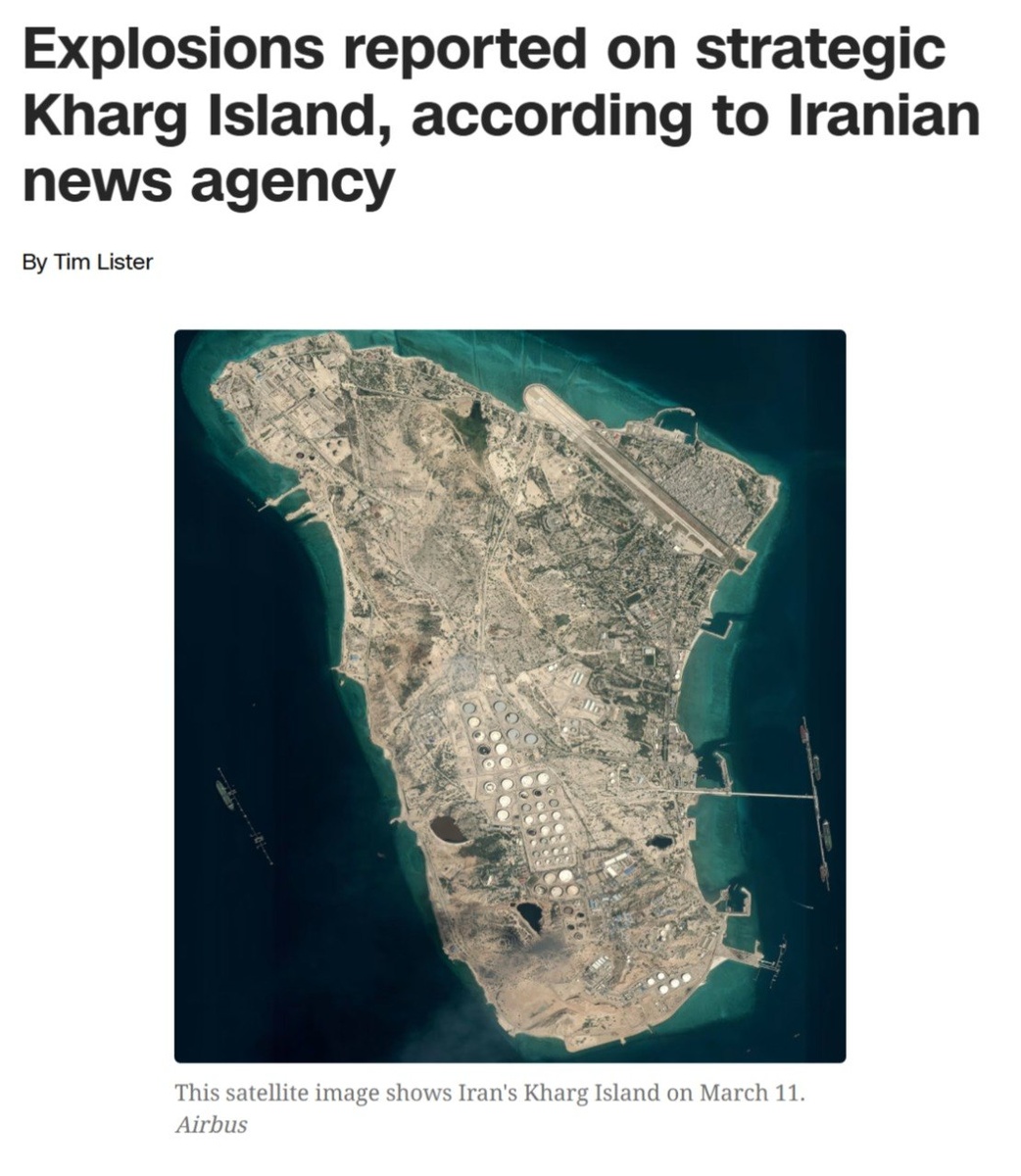 Он добавил, что удары не были направлены на нефтяные объекты. По данным полуофициального иранского информационного агентства Mehr, на иранском острове Харг, откуда экспортируется почти вся иранская нефть, прогремели взрывы. Остров Харг примерно в три раза меньше Манхэттена, но играет ключевую роль в экономике Ирана, обеспечивая около 90% экспорта нефти из страны. Он расположен в самой северной части Персидского залива, вдали от Ормузского пролива, но в непосредственной близости от иранских нефтяных объектов. Почти каждый день миллионы баррелей сырой нефти с крупнейших месторождений Ирана, в том числе в Ахвазе, Маруне и Гачсаране, по трубопроводам поступают на остров, который иранцы называют «Запретным островом» из-за жесткого военного контроля. Длинные причалы, уходящие в воду на достаточную глубину, чтобы принимать нефтяные супертанкеры, делают остров важнейшим пунктом для транспортировки нефти. Вместимость хранилищ на месторождении Харг оценивается примерно в 30 миллионов баррел