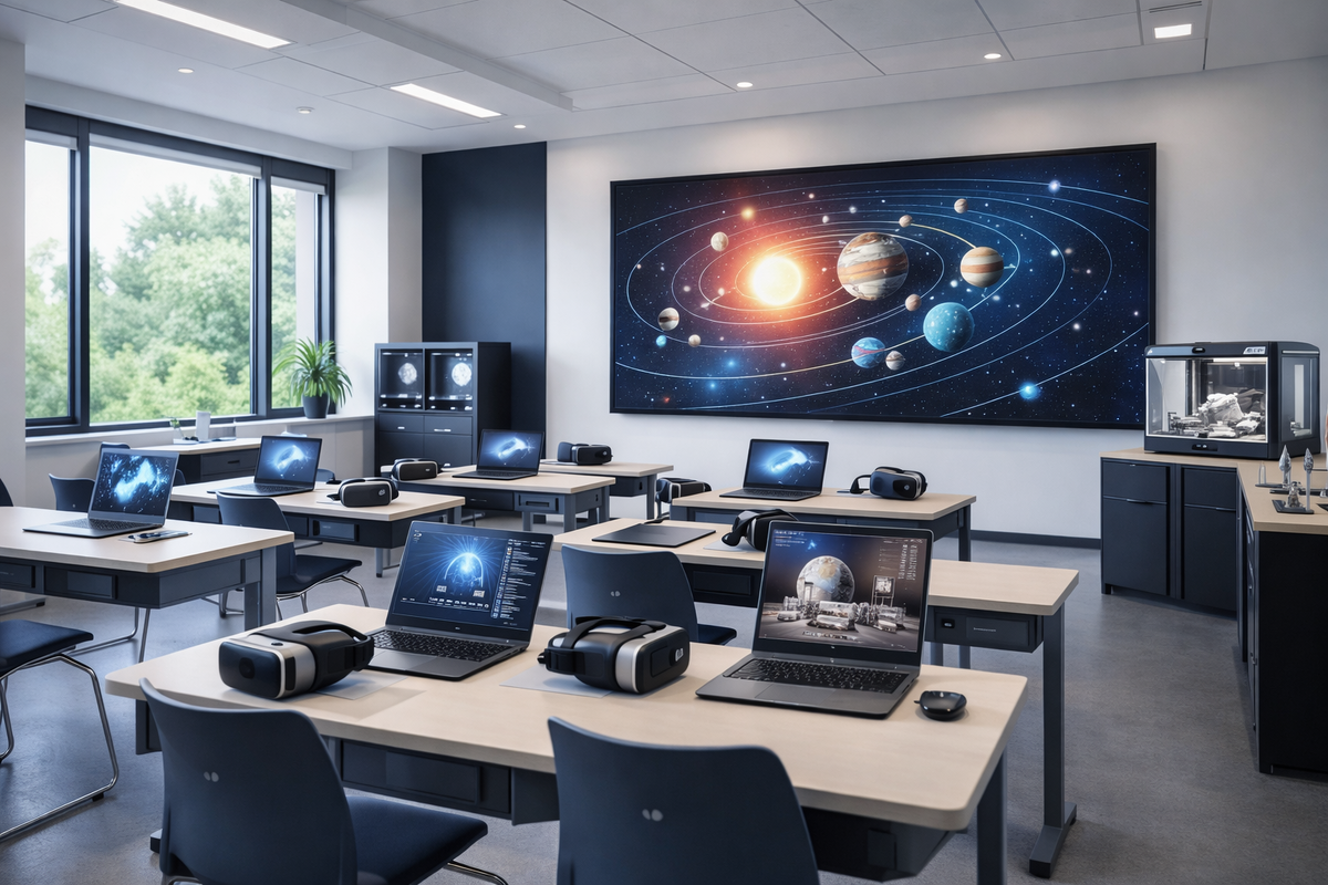 Космический класс помогает: Это уже не просто тематически оформленный кабинет, а рабочее учебное пространство, где можно проводить уроки, демонстрации, практические занятия и проектную работу. Создать космический класс — значит подобрать оборудование под конкретные задачи учреждения, возраст учеников, формат занятий, по