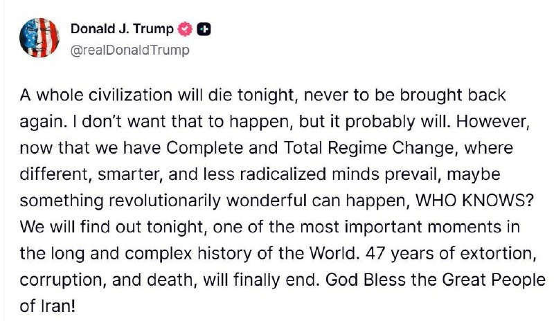 «Сегодня ночью погибнет целая цивилизация, и её уже никогда не вернуть. Я не хочу, чтобы это произошло, но, скорее всего, так и будет. Однако теперь, когда произошла полная и тотальная смена режима, где преобладают другие, более умные и менее радикализированные умы, может быть, произойдет что-то революционно прекрасное, КТО ЗНАЕТ? Мы узнаем это сегодня вечером, в один из самых важных моментов в долгой и сложной истории мира. 47 лет вымогательства, коррупции и смерти наконец-то закончатся. Да благословит Бог великий народ Ирана!» — Всё ясно, делириум тременс. — Что? — Белая горячка… — Да-да, белый, горячий, совсем белый! О том, куда могут полететь ракеты спятившего деда, писал в своем канале в МАХ. @КОЦ