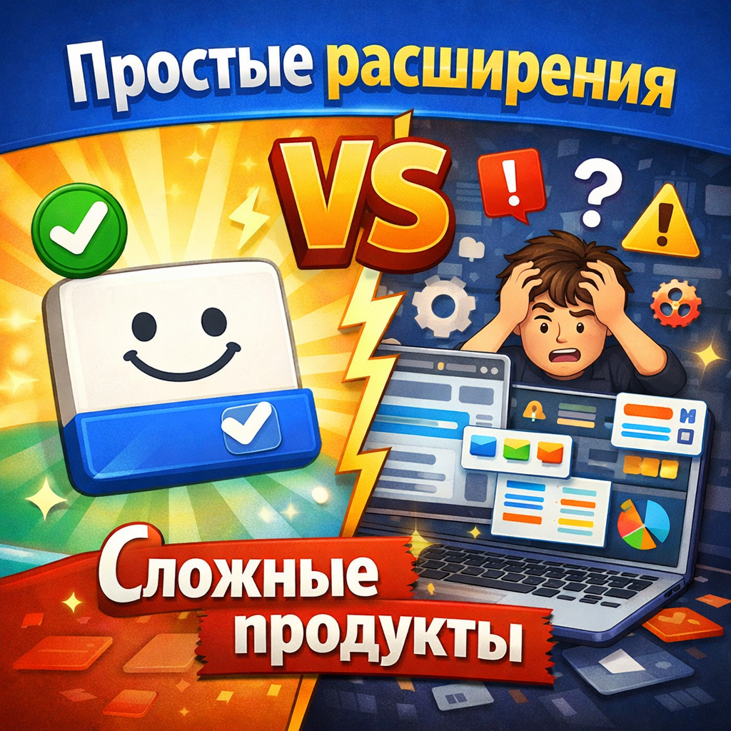 Сложное расширение встречает тебя настройками, профилями, режимами и авторизацией. А простое — одной кнопкой, которая сразу даёт результат. Во втором случае польза видна мгновенно.