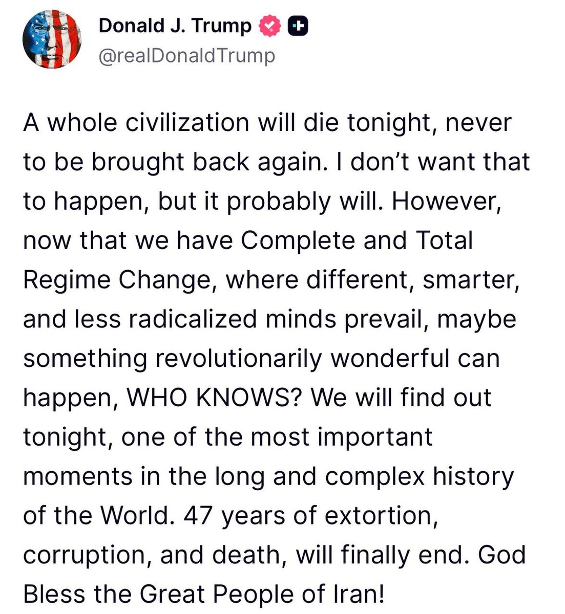 💬 «Целая цивилизация погибнет этой ночью и уже никогда не вернётся», — заявил Трамп