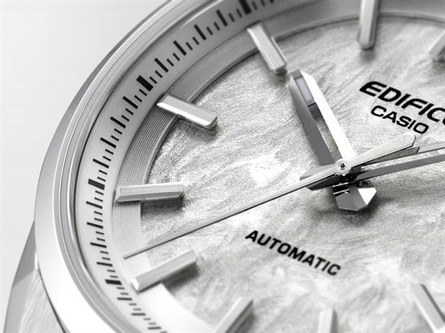 Casio расширила линейку EDIFICE и вывела в нее новую механическую серию EFK-110. Каждая из трех версий оценена в 49 500 иен, а сама модель выглядит как попытка дать бренду более доступную механическую точку входа без отказа от привычного для EDIFICE спортивно-автомобильного характера. Новинка получила компактный стальной корпус диаметром 38 мм, японский автоматический механизм, запас хода около 42 часов, сапфировое стекло и водозащиту 10 атмосфер. На задней крышке установлен прозрачный элемент, поэтому владелец может наблюдать работу механики, что для этой ценовой зоны выглядит особенно выигрышно. Одним из ключевых акцентов стал циферблат. Casio использует текстуру, полученную методом электрoформинга, а также полые стрелки, полированные барные индексы и отдельное кольцо с тонкой шлифовкой. За счет этого часы не выглядят упрощенной «механикой ради механики», а сохраняют аккуратную визуальную сложность. Корпус и браслет построены на сочетании сатинированных и зеркально отполированных по