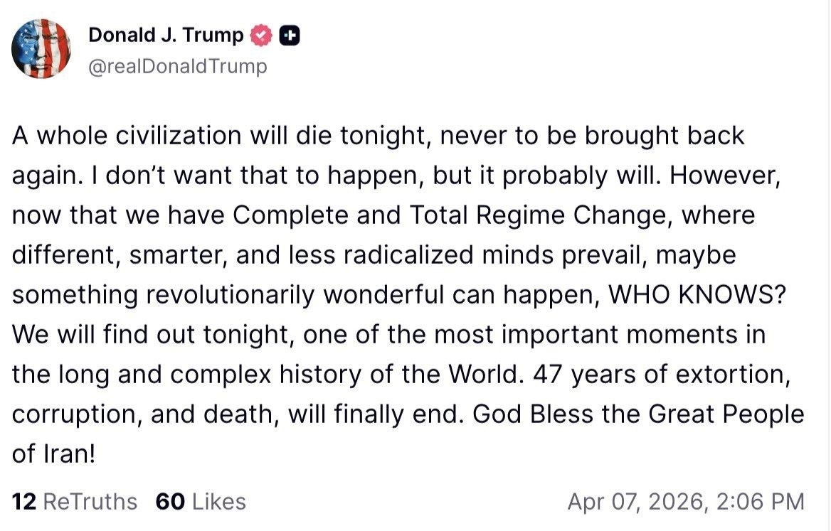 : Сегодня ночью погибнет целая цивилизация, и она уже никогда не возродится. Я не хочу, чтобы это произошло, но, скорее всего, так и будет. Однако теперь, когда произошла полная и окончательная смена режима, когда у власти оказались другие, более умные и менее радикально настроенные люди, возможно, произойдет что-то революционно прекрасное. КТО ЗНАЕТ? Мы узнаем это сегодня вечером, в один из самых важных моментов в долгой и сложной истории человечества. 47 лет вымогательства, коррупции и смертей наконец закончатся. Да благословит Господь великий народ Ирана! Подписаться на канал | 📲 MAX Мы в ВКонтакте