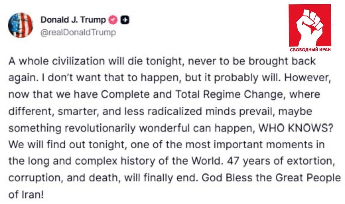 ⏳ Крайний срок для сделки истекает сегодня в 20:00 по местному времени, а в ответ КСИР уже пригрозил США и союзникам нефтью и газом на годы вперед. Иран по-прежнему отвергает перемирие без полного прекращения конфликта и снятия санкций. Подпишитесь на канал