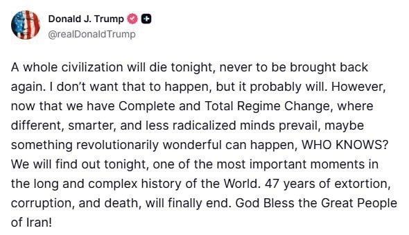 ։ Մենք այսօր երեկոյան կիմանանք՝ աշխարհի երկար և բարդ պատմության ամենակարևոր պահերից մեկը։ 47 տարվա շորթումը, կոռուպցիան և մահը վերջապես կավարտվեն։ Աստված օրհնի Իրանի մեծ ժողովրդին։ Դոնալդ Թրամփ