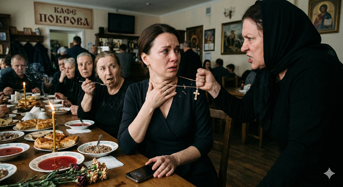 Поминальный зал кафе «Покрова» пропах кислыми щами и дешевым ладаном — кто-то из родственниц притащил с кладбища недогоревшую свечу. Я сидела во главе стола, глядя на то, как в тарелке с киселём медленно тонет кусок поминального пирога. В голове билась одна мысль: надо было надеть закрытое платье, а не этот джемпер с глубоким вырезом.